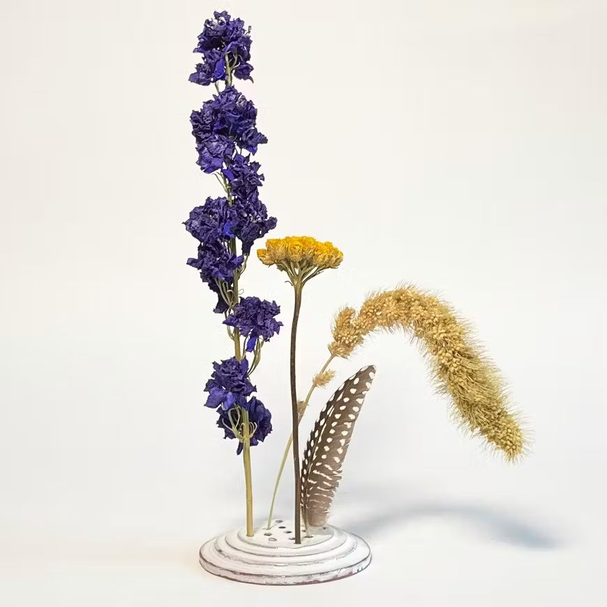 Een prachtige, eenvoudige bloemenhouder voor droogbloemen, veren, grassen of wierook. Je maakt gemakkelijk een arrangement door de stelen in de gaatjes te steken. Leuk om te gebruiken voor een arrangement onder een stolp en op die manier lang te kunnen genieten van je droogbloemen en andere vondsten. Geeft een persoonlijke en natuurlijke toevoeging aan ieder interieur.