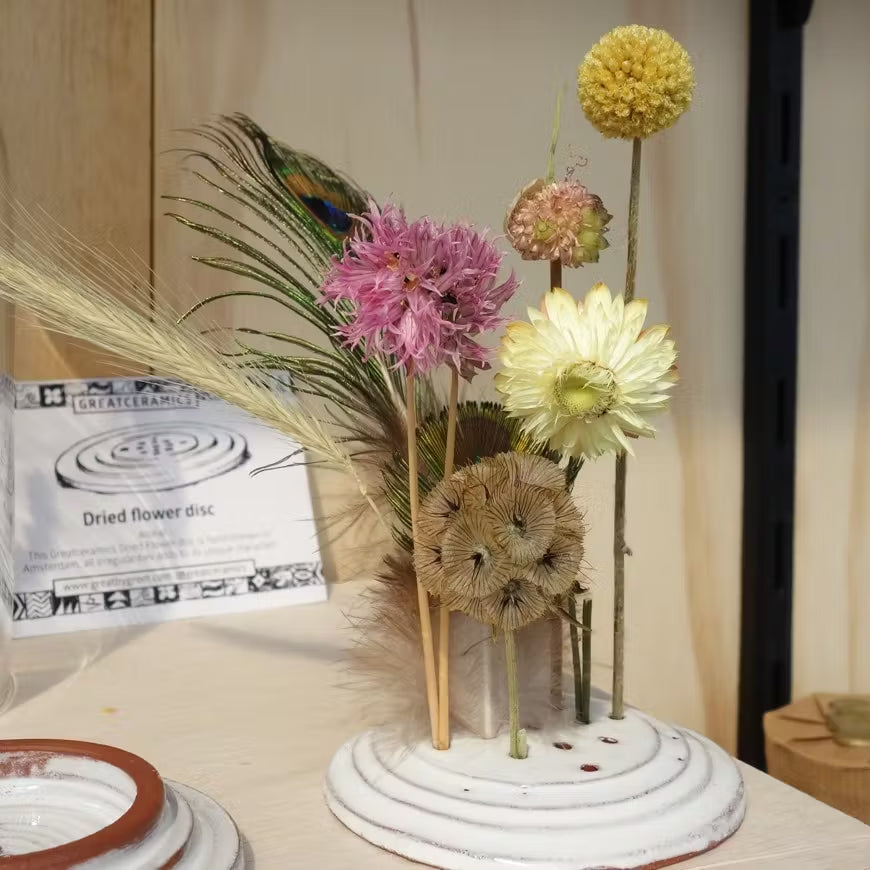 De bloemenhouders zijn handgemaakt in een atelier in Amsterdam. Greetje maakt daar in haar studio prachtige keramiekproducten van natuurlijke materialen. Ieder product is handgemaakt en uniek. Kleine verschillen zijn er dus altijd en maken het product juist zo mooi.